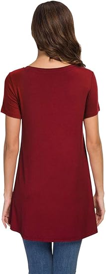 This basic tunic top is made of 95% rayon and 5% spandex, which is very soft and stretchy. It is machine washable and dryer safe. It will not shrink. This tunic top has a flowing and beautiful hem that flatters the tummy and bottom area, giving you a better shape.